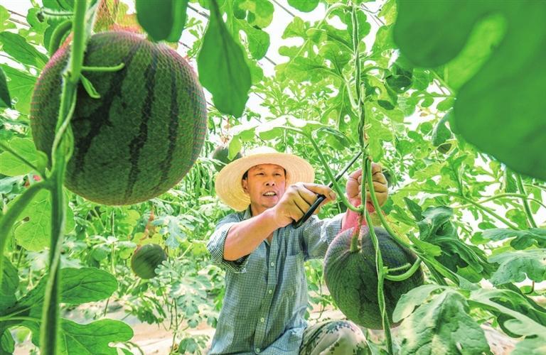新城镇新城村种植户胡新海剪下自家大棚已成熟的吊蔓西瓜。李巍