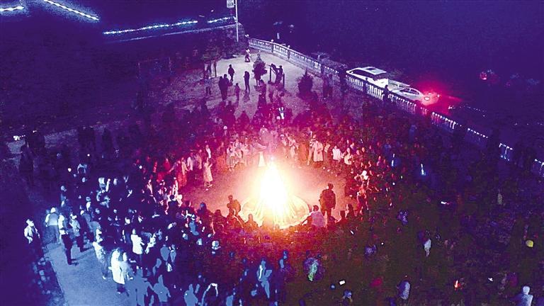 熊熊篝火燃起,游客们手拉手、肩并肩一起围着篝火,跳起优美的锅庄舞;烧烤、柴火鸡、围炉烤肉等各色美食,让他们一边品尝美食,一边感受乡村游带来的独特享受。