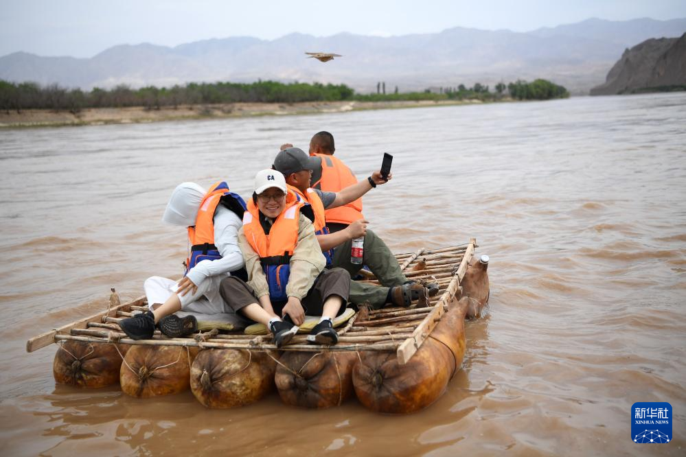 游客在黄河石林景区体验羊皮筏子漂流(7月11日摄)。新华社记者 陈斌 摄