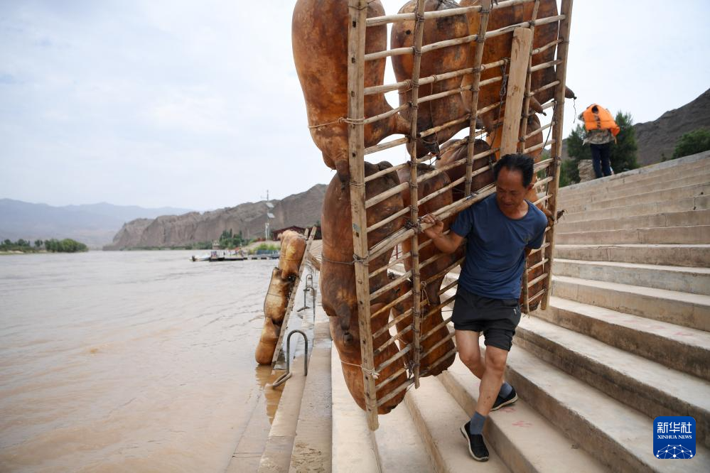 一名筏子客在黄河石林景区背着羊皮筏子准备漂流(7月11日摄)。新华社记者 陈斌 摄