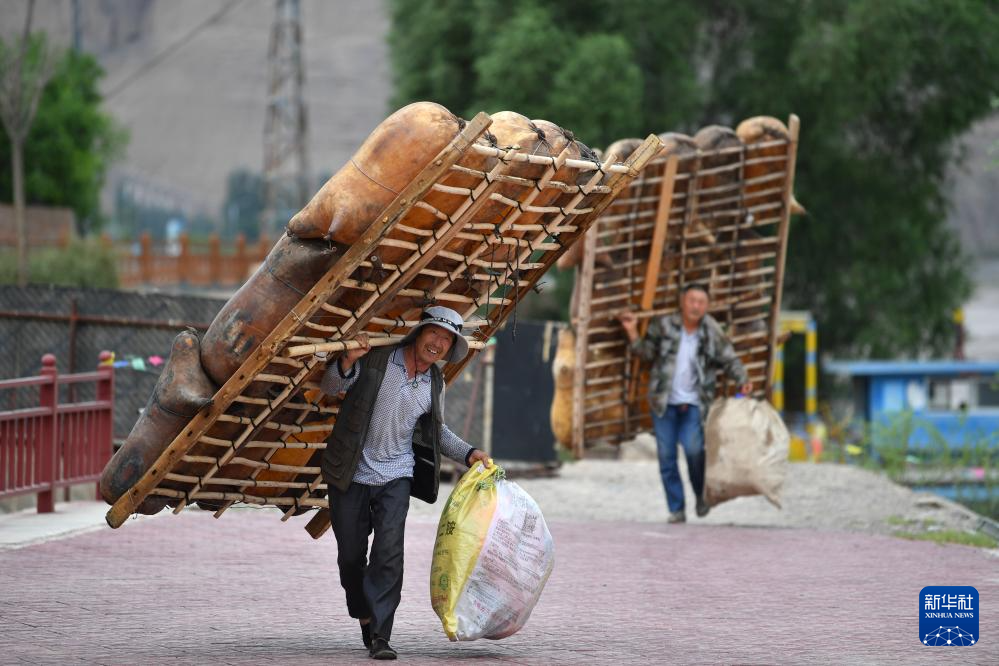 两名筏子客在黄河石林景区背着羊皮筏子准备漂流(7月11日摄)。新华社记者 张可任 摄