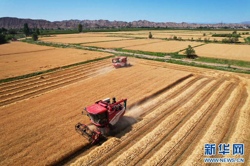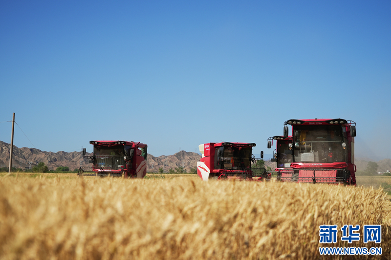 近日,甘肃省金昌市金川区3万余亩小麦麦收工作陆续展开。当地农民紧抓农时开展夏收作业,确保小麦颗粒归仓。新华网发(张宏斌 摄)