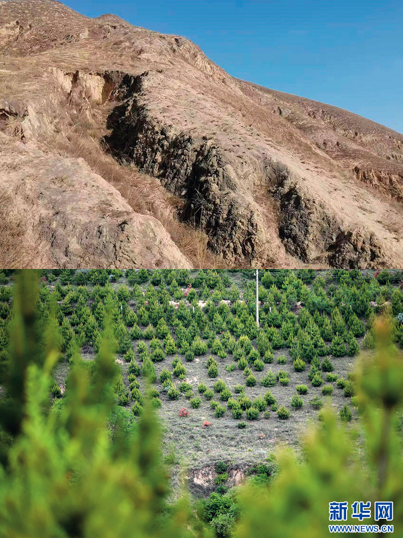 拼版照片:上图为2013年拍摄的华池县南梁镇高台村荒山景象(资料图片,华池县自然资源局供图);下图为2022年5月25日拍摄的华池县南梁镇高台村万亩苗林示范点景象(新华社记者陈斌摄)。
