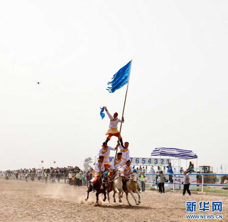 青海省格尔勒马术表演队正在进行“马上叠罗汉”表演。新华网发(温晨钰 摄)