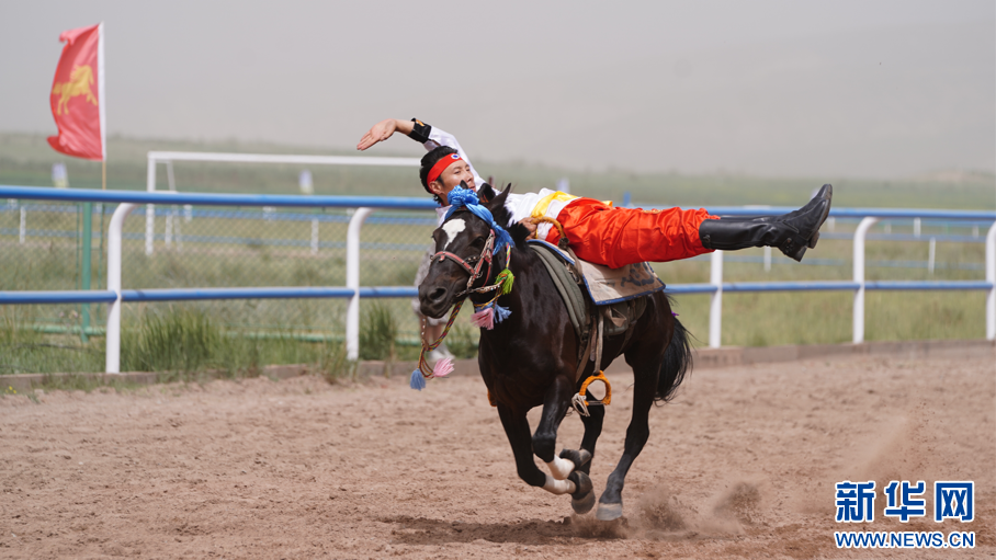 青海省格尔勒马术表演队正在进行“马上单人单马技巧”表演。新华网发(受访者供图)
