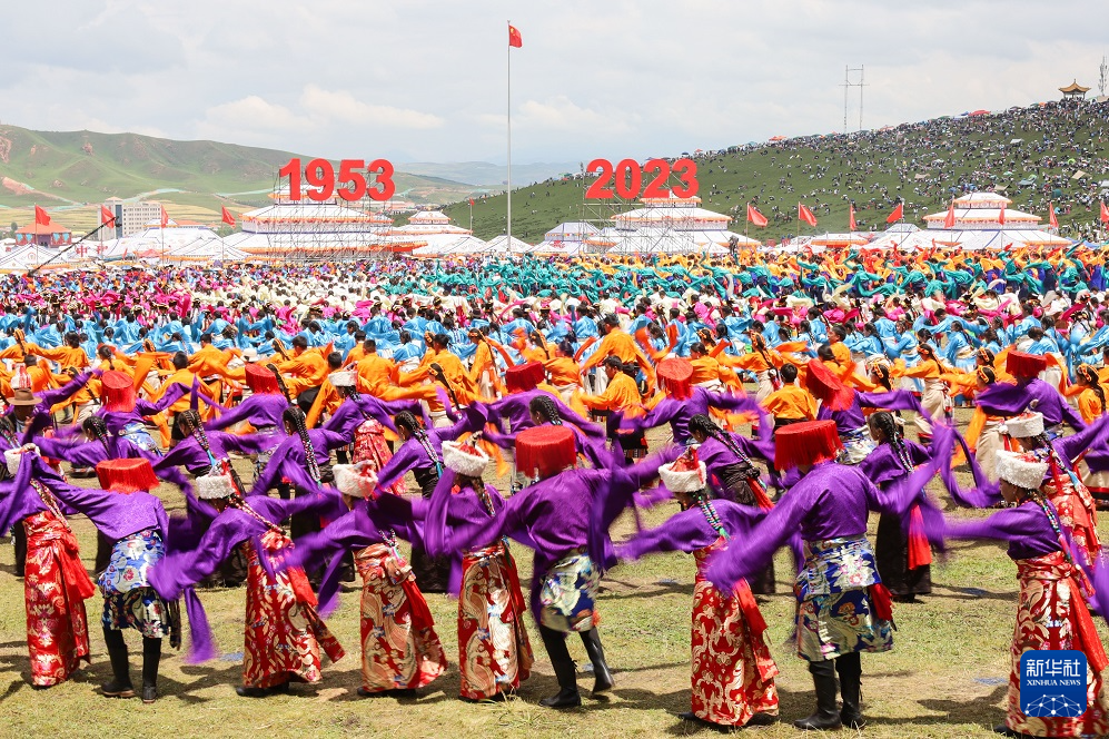新华网兰州8月11日电(记者谭飞、胡伟杰、马希平)10日上午,甘肃省甘南藏族自治州合作市当周草原上,一场盛大的草原歌舞盛宴开始上演。甘南州成立70周年庆祝大会正在举行中。