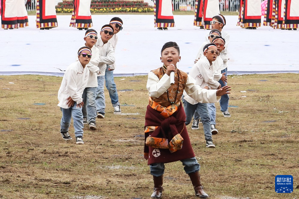 8月10日,小朋友在甘南藏族自治州成立70周年庆祝大会上表演节目。新华社记者 马希平 摄