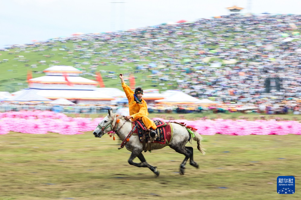 这是8月10日在甘南藏族自治州成立70周年庆祝大会上拍摄的马术表演。新华社记者 马希平 摄