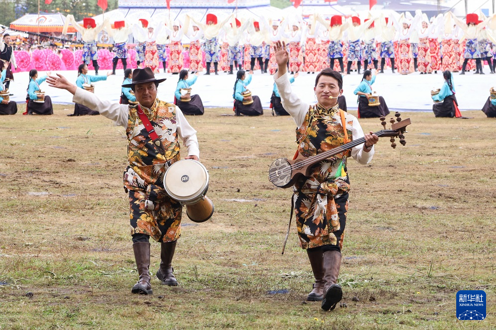 8月10日,演员在甘南藏族自治州成立70周年庆祝大会上表演节目。新华社记者 马希平 摄