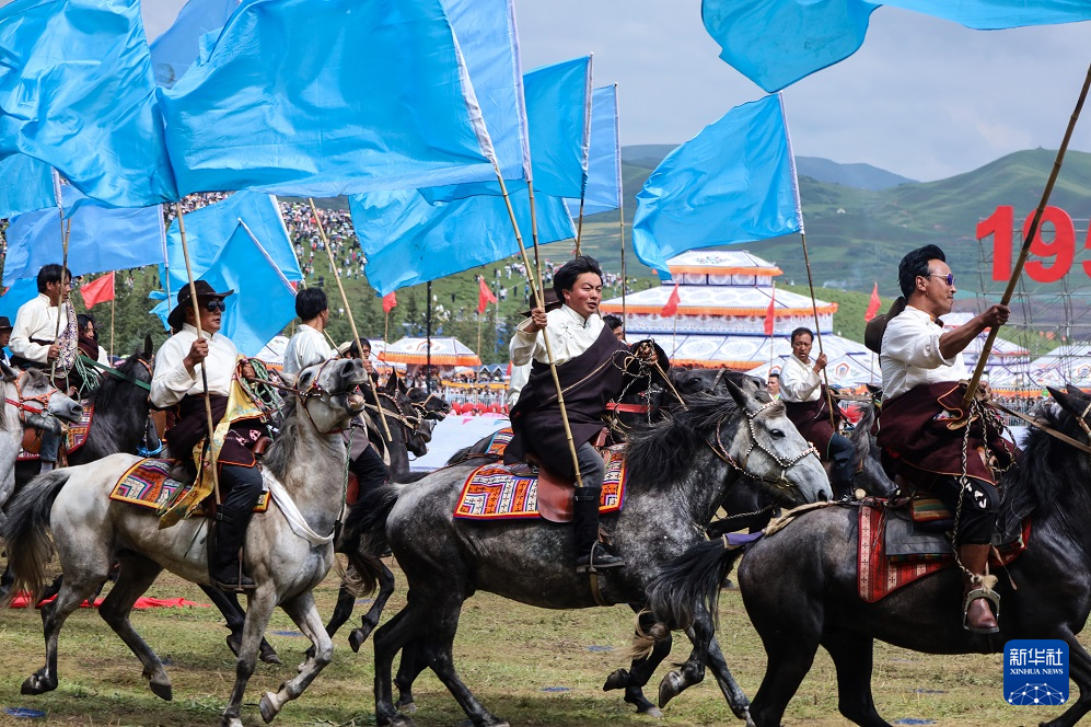 这是8月10日在甘南藏族自治州成立70周年庆祝大会上拍摄的马队入场表演。新华社记者 马希平 摄