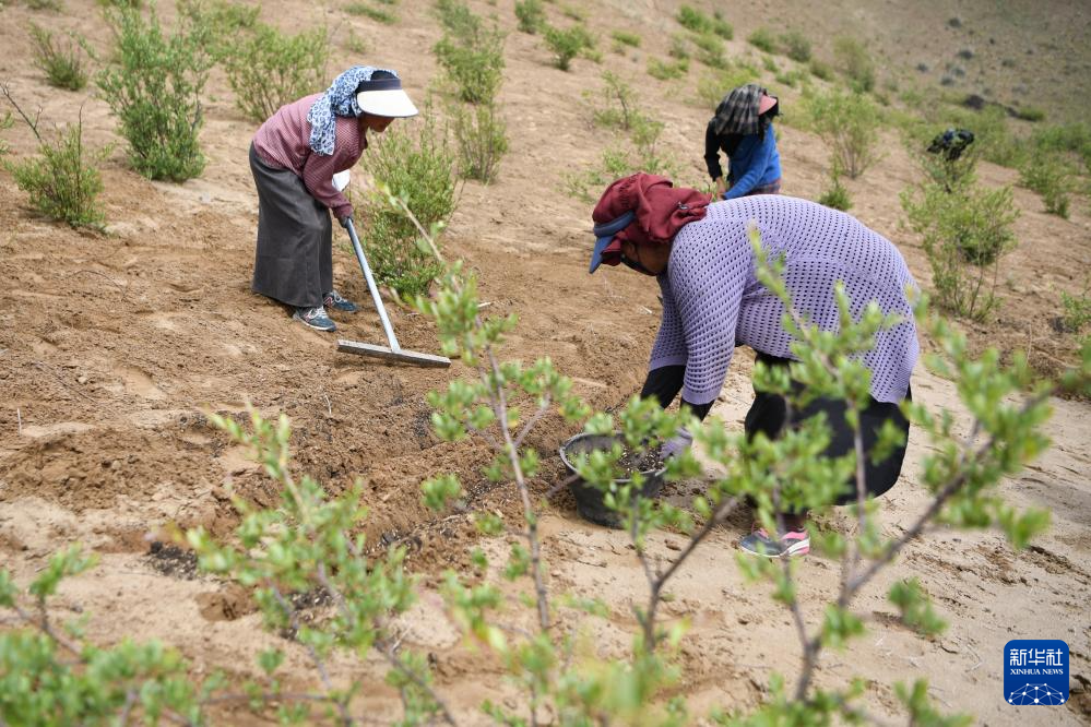牧民在玛曲县欧拉镇黄河沿岸一处沙化草原治理点补种草籽(7月6日摄)。新华社记者 方欣 摄