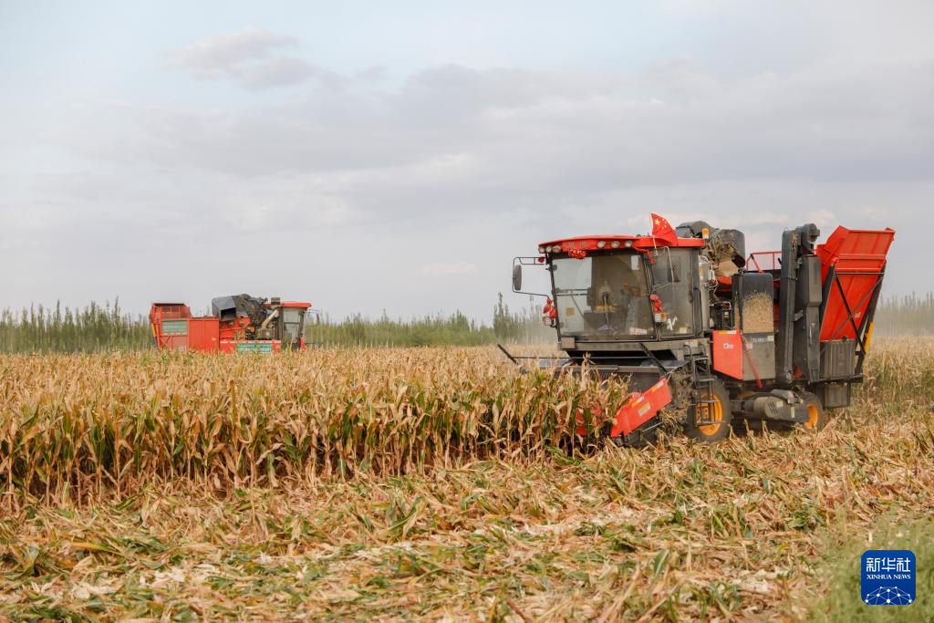 9月19日,甘肃省张掖市甘州区碱滩镇农户通过机械化作业收获制种玉米。新华社记者 方欣 摄