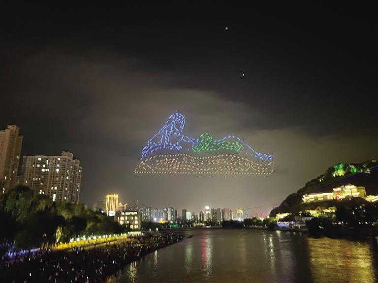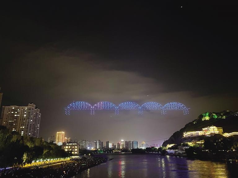 9月29日晚8时,“黄河·印象”国庆大型无人机演出秀活动首场“印象·兰州”航空之夜在兰州黄河风情线近水广场举行,1000架无人机编队在黄河上空开启了一场灯光秀表演。