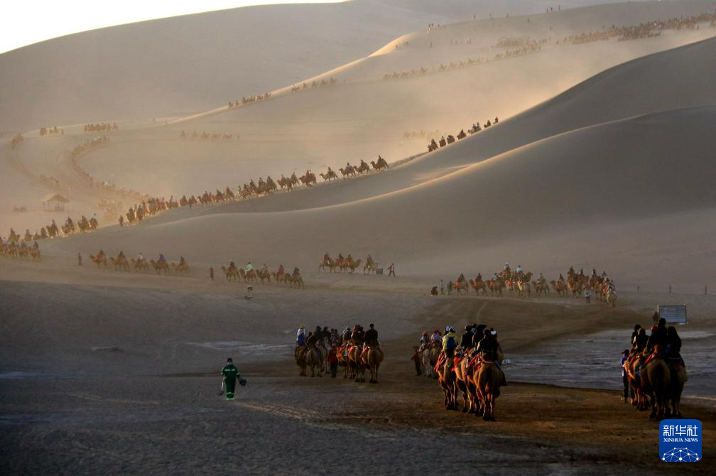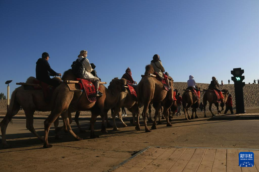 10月2日,游客在甘肃省敦煌市鸣沙山月牙泉景区体验骑骆驼。新华社发(张晓亮 摄)