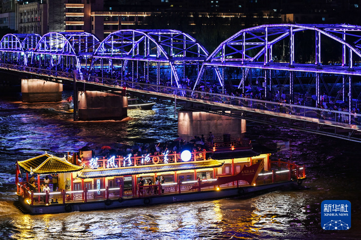 游客乘船穿过兰州黄河铁桥——中山桥。新华社记者 范培珅 摄