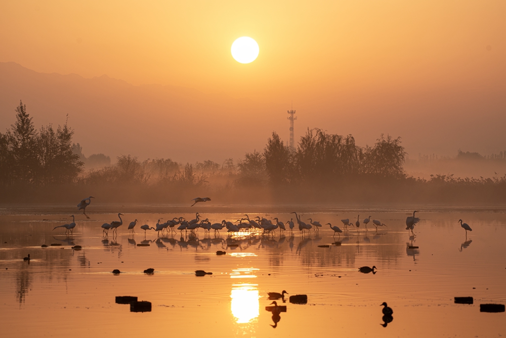 近日,在晨雾弥漫的甘肃省张掖国家湿地公园,成群的白鹭迎着朝阳或悠闲踱步,或翩翩起舞,平静的湖面像一面巨大的镜子,将山峦、绿树与飞鸟尽收其中,水天一色,美不胜收。新华网发(刘旭明 摄)