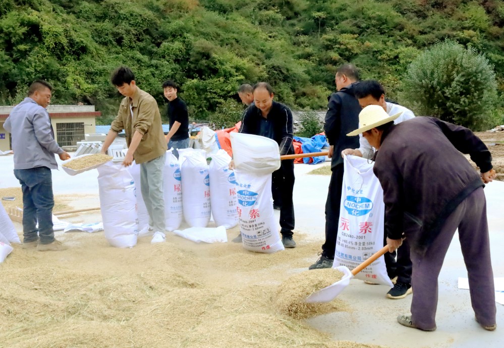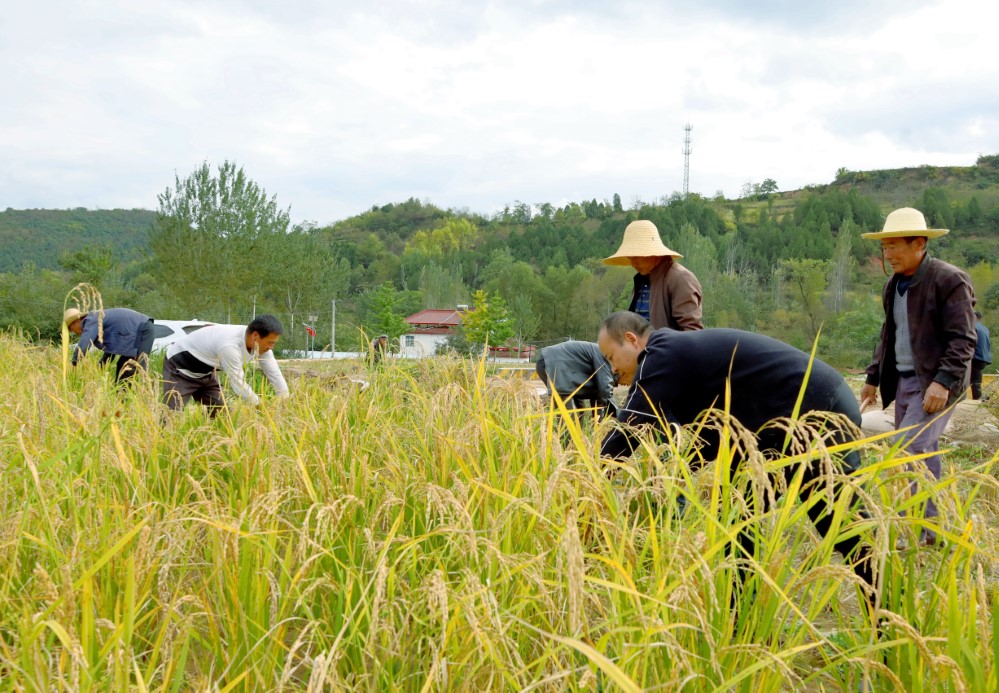 人间最美是金秋,最美秋色是丰收。寒露时节刚过,甘肃成县陈院镇300多亩旱改水项目种植的水稻,迎来了项目实施后的第一个收割季。在秋日阳光的映照下,一片片农田被染成一湾湾金黄,微风吹着稻浪,处处散发着稻谷的清香,呈现出充满丰收喜悦的美丽画卷。甘肃渔乐谷香源种植农民专业合作社负责人王剑带领着群众在趁着晴好天气抢收水稻。