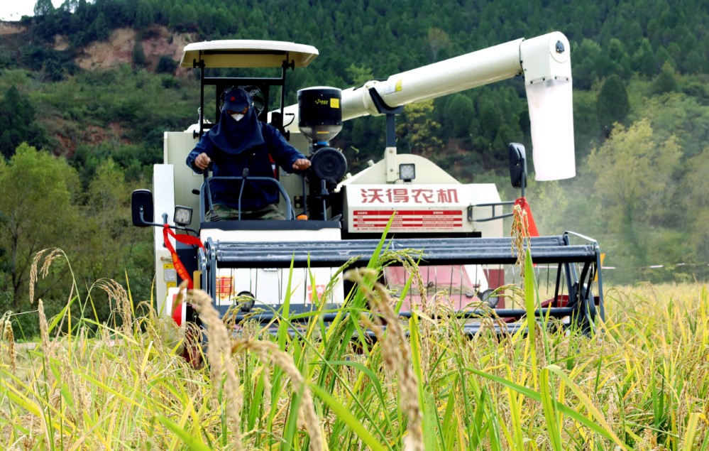 机械化作业为水稻收割按下快进键。 刘建军 摄