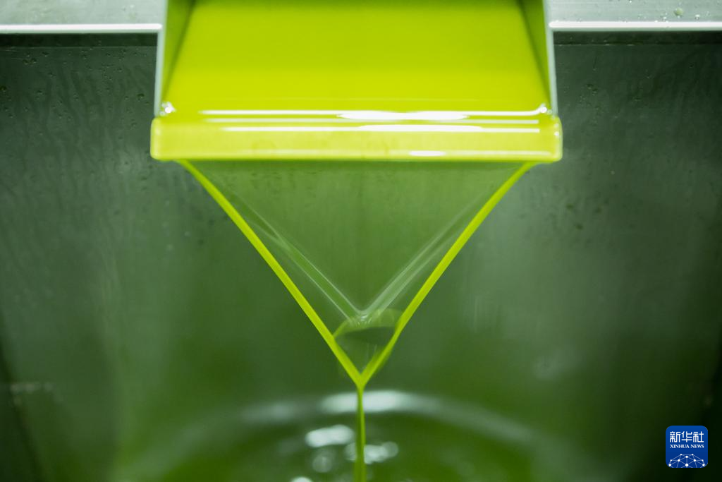 在祥宇油橄榄公司生产线上,初榨橄榄油正在流出(10月11日摄)。新华社记 者郎兵兵 摄