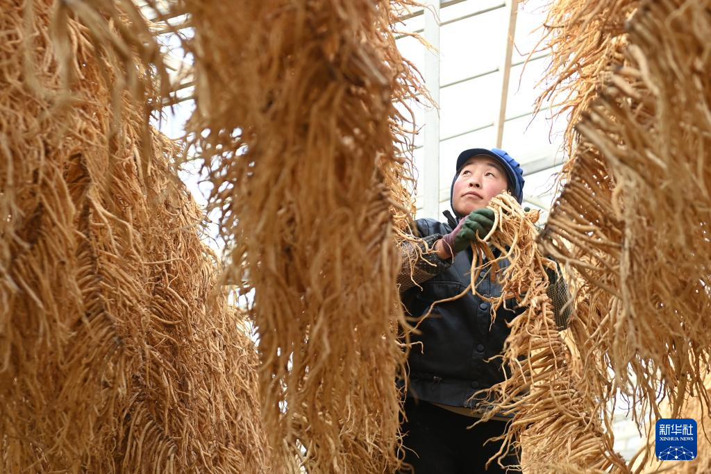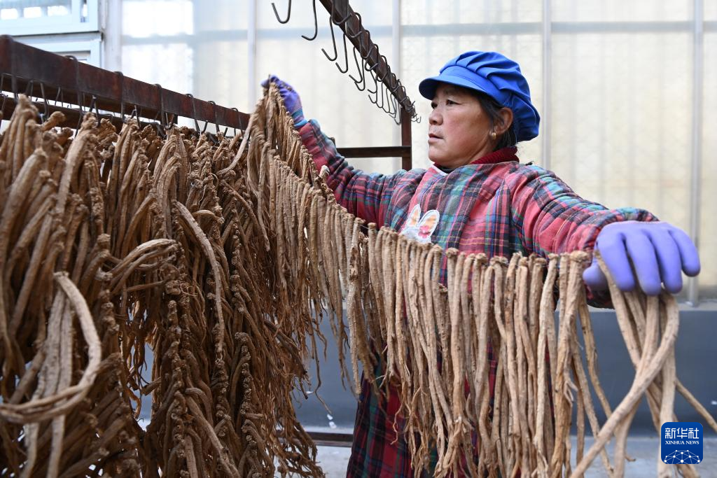 10月20日,在岷县一家中药材加工企业,工作人员整理晾晒的党参。新华社记者 范培珅 摄