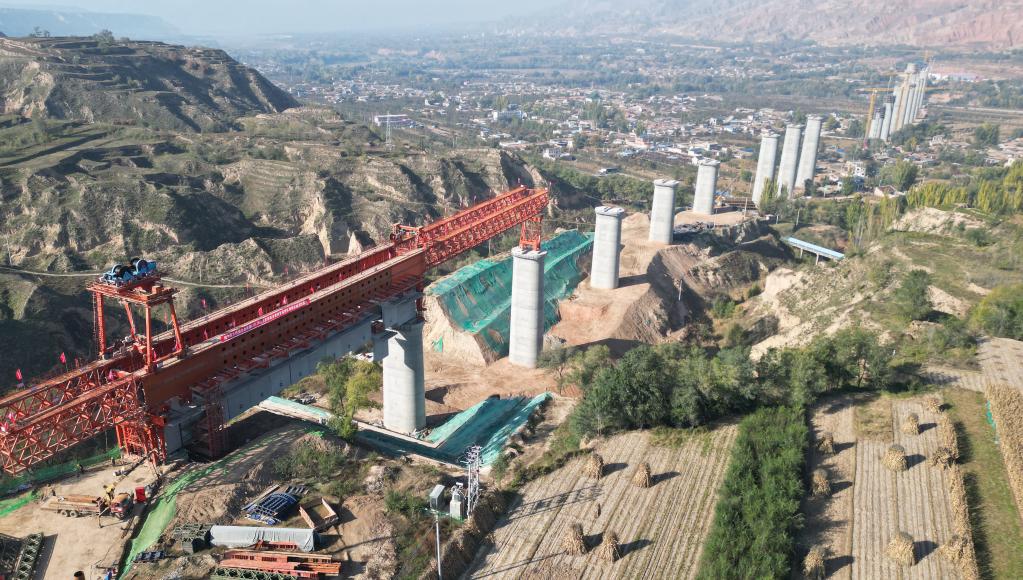 10月24日拍摄的位于甘肃临夏境内的兰合铁路4标段泄湖峡大夏河特大桥胶拼梁架设施工现场(无人机照片)。新华社发(史有东摄)