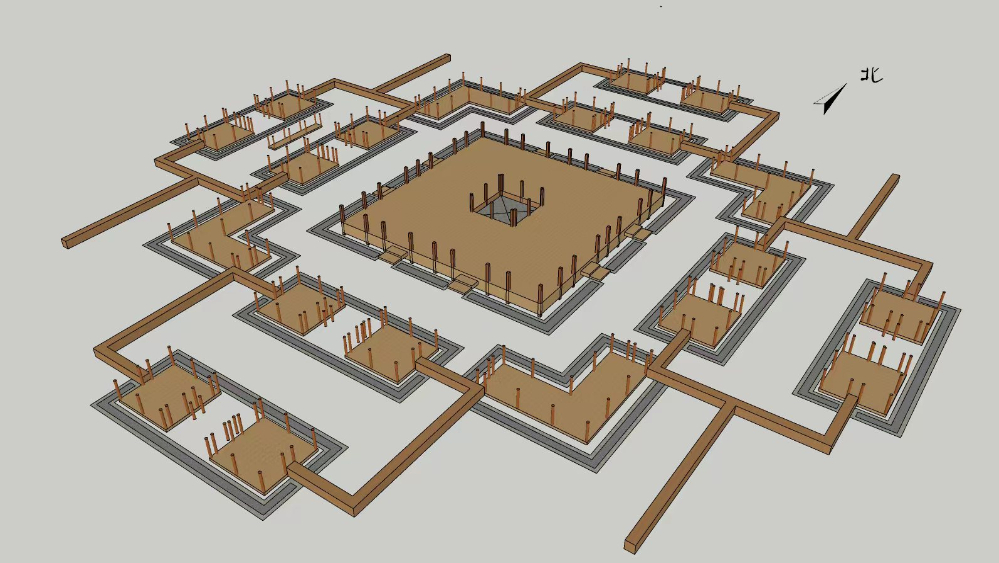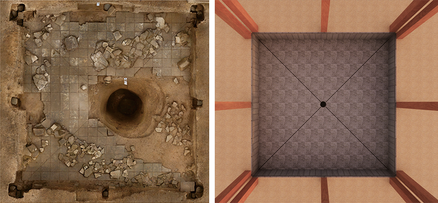 中部夯土台基的中心发现一处神秘的半地穴空间。它的地面铺素砖,四壁贴壁砖并用铁钉固定,各砖缝之间还用特殊材料专门做了“美缝”处理。种种迹象表明此处可能是一个“水池”,但中间被一口竖井状大坑破坏。