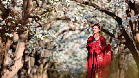 赏梨花是兰州人每年踏青时的必备项目,登楼看四面梨花的场景被清代兰州地方志列为“金城十景”之一。