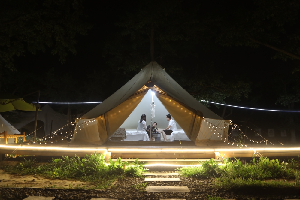 游客在古梨园内的“趣野星辰”露营基地游玩(2023年8月17日摄)。新华社记者 马莎 摄