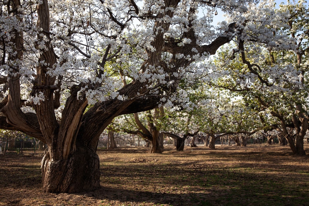 9423株树龄百年以上的古梨树,年纪最大的已近500岁。3000多户人家依梨园而居,千百年来,生生不息。每到春天,参天大树万花齐放,雪白梨花铺天盖地。在黄土梁峁下、奔腾黄河边绽放出生命的壮丽意境。