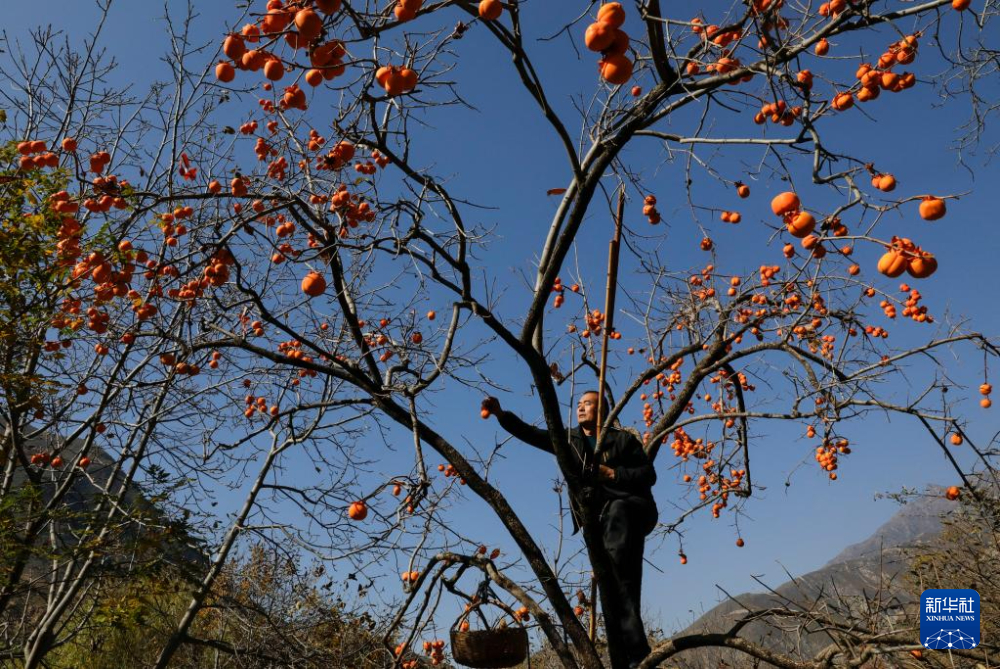 11月14日,在甘肃省甘南藏族自治州舟曲县立节镇杰迪村,村民在采摘柿子。新华社记者 方欣 摄
