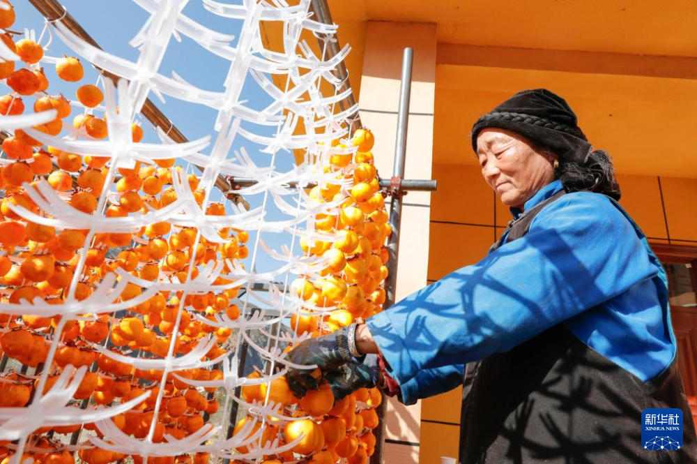 11月14日,在甘肃省甘南藏族自治州舟曲县立节镇杰迪村,村民在晾晒柿子。新华社记者 方欣 摄
