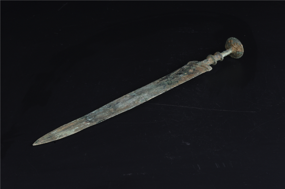剑,古之圣品,至尊至贵,素有“百兵之君”的美称。其“开双刃身直头尖,横竖可伤人,击刺可透甲。凶险异常,生而为杀”。在我国,对于青铜剑的铸造记载,始于商代。当时的剑身一般较短,形状就像柳树的叶子,做工较为粗糙。春秋晚期以后,青铜剑的制作逐渐成熟,此时的青铜剑,剑身普遍被加长到五六十厘米。一把青铜剑主要由剑身和剑茎两部分组成,所谓剑“茎”就是剑的把手。在剑茎和剑身之间还有一块凸起来的隔板,叫做“格”。