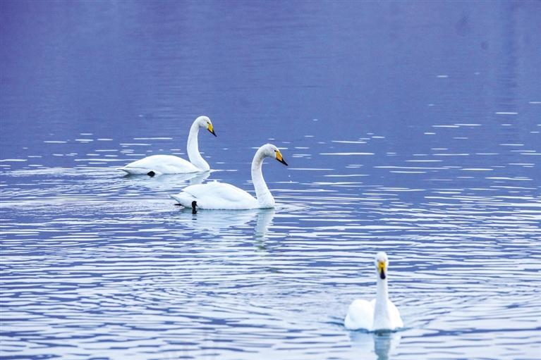 “生态好不好,鸟儿是晴雨表。”近日,西固区达川镇三河口迎来了今年首批越冬大天鹅,吸引了众多市民游客前往观赏。记者从兰州市林业局了解到,目前黄河兰州段湿地分布和栖息的湿地鸟类约有68种,其中,国家I级重点保护鸟类3种(黑嘴鸥、黑鹳、白尾海雕),国家II级保护鸟类5种(大天鹅、鸳鸯、鹮嘴鹬、白腰杓鹬、鹗)。鹊鸭、绿头鸭、斑嘴鸭、普通秋沙鸭和渔鸥等优势越冬水鸟种群数量较大,主要栖息地分布在沿线各滩涂地,栖息地质量较高。