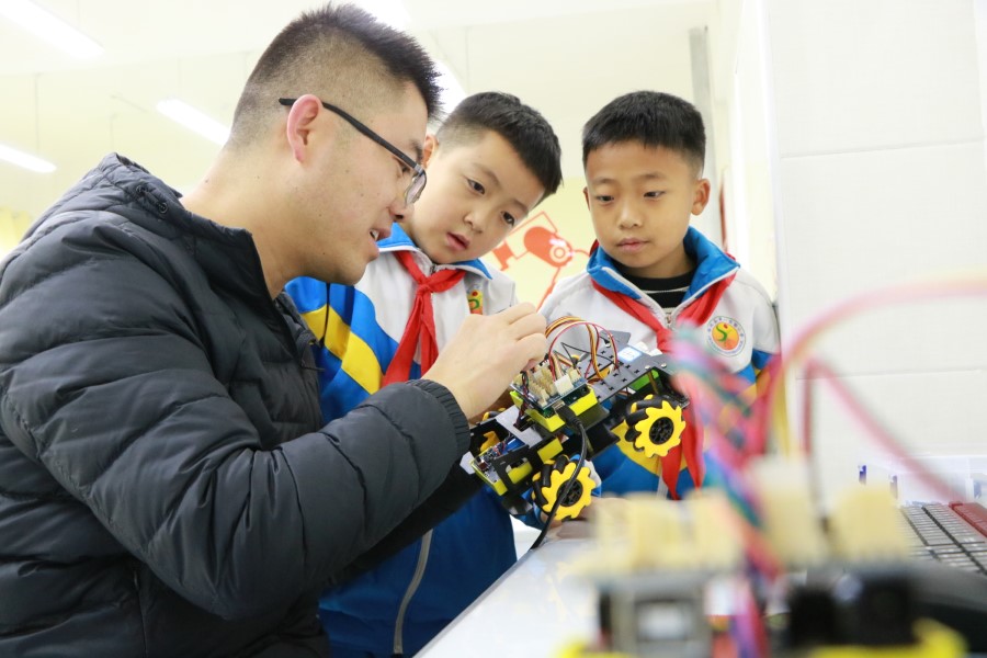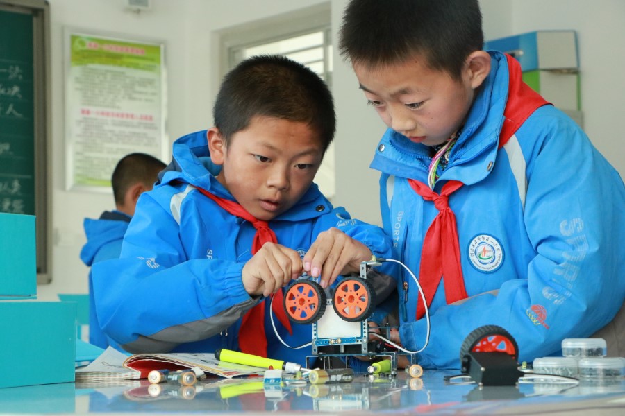 渭源县清源镇第一小学的科技社团,学生们组装机器人。尹晓军 摄
