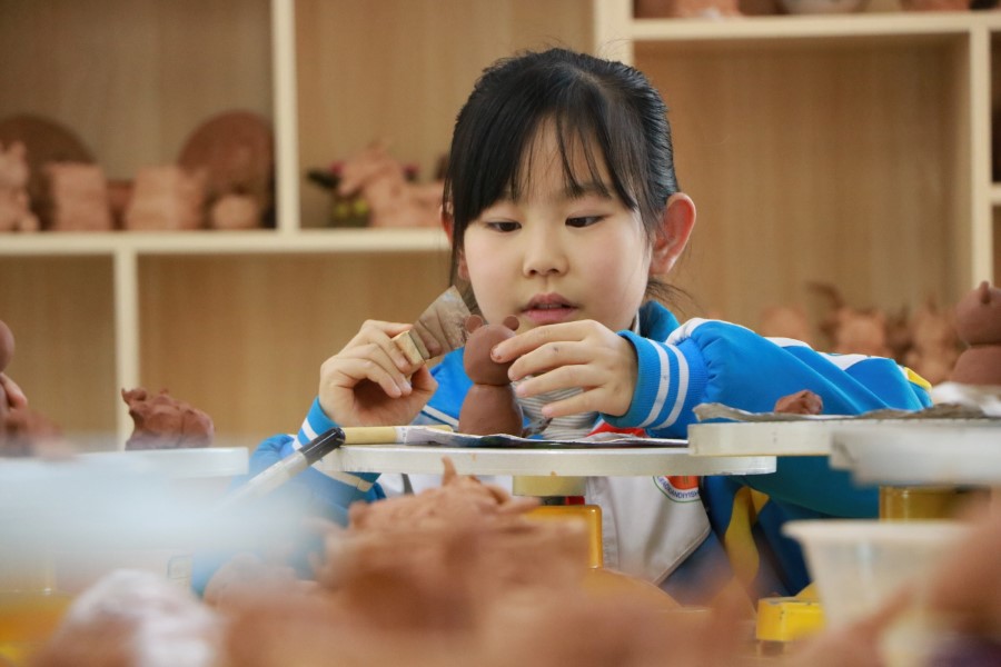临洮县第一实验小学学生在陶艺工作坊制作陶泥作品。尹晓军 摄