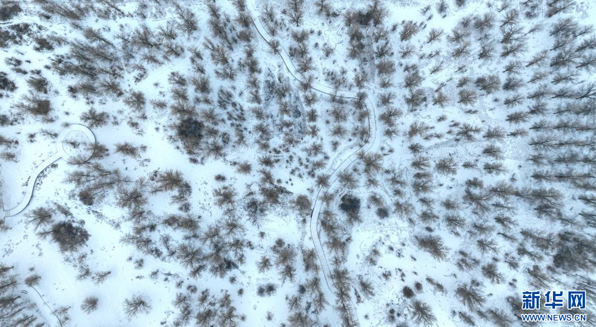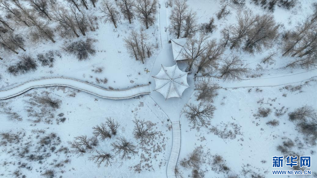 这是12月14日拍摄的甘肃省酒泉市金塔沙漠胡杨林景区雪景(无人机照片)。新华网发(曹红祖 摄)