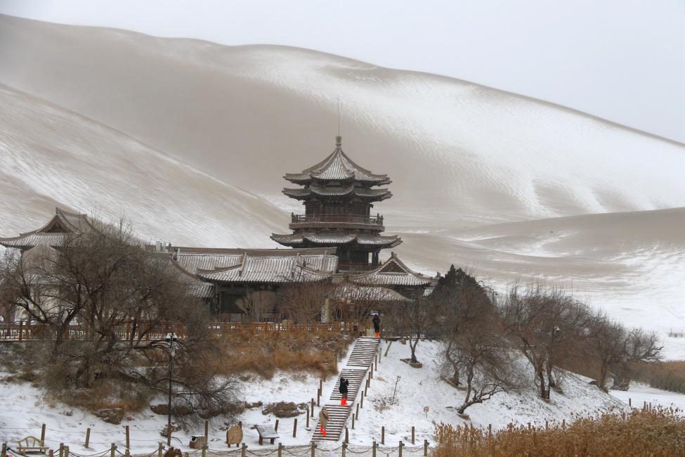 这是12月14日拍摄的鸣沙山月牙泉景区雪景。新华网发(张晓亮 摄)