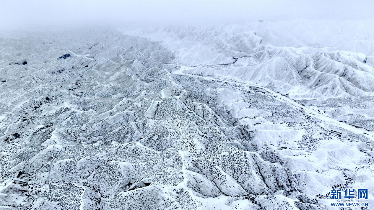 这是12月14日在张掖七彩丹霞景区拍摄的丹霞雪景(无人机照片)。新华网发(郭浩 摄)
