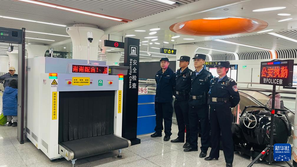 1月4日,兰州市公安局交通治安分局火车站轨道治安派出所教导员牛鸿雁(右一)在地铁安检入口处执勤。新华社记者 李杰 摄