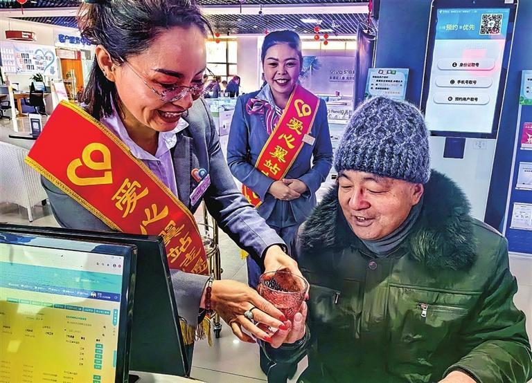 在爱心翼站,营业人员送上热茶,也送上了电信的关怀。