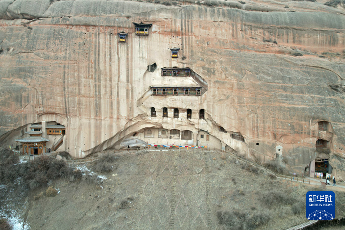 这是1月22日在甘肃省张掖市肃南裕固族自治县马蹄藏族乡境内拍摄的马蹄寺石窟群——北寺石窟景象。