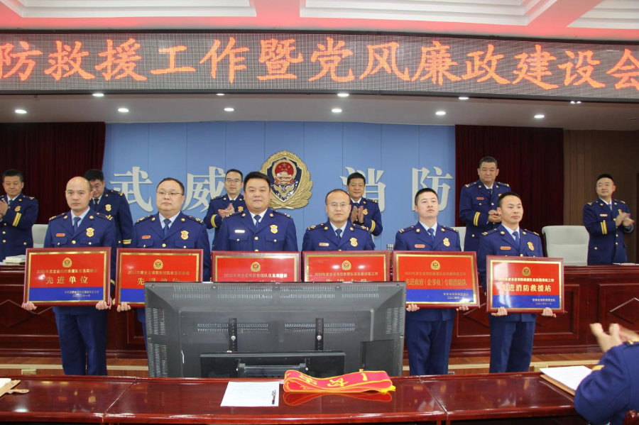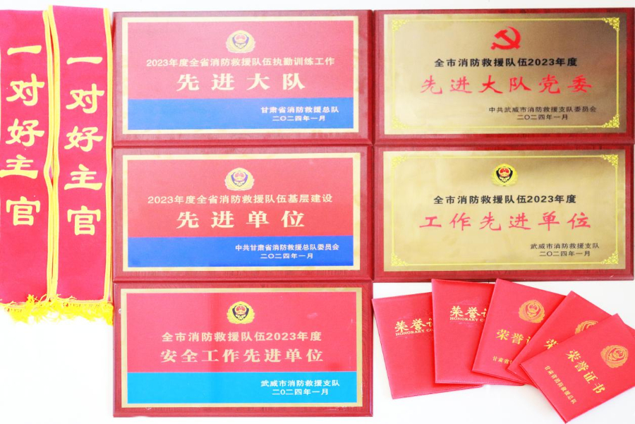 1月25日,武威市消防救援支队召开2024年全市消防救援工作暨党风廉政建设会议,总结2023年工作,表彰先进、分析形势,全面部署2024年工作任务。民勤大队2023年度工作中荣获多项荣誉,先后被授予“全省青年文明号”、“优秀基层党组织”、执勤训练工作“先进大队”、基层建设“先进单位”,被支队评为全市“先进大队党委”,昌宁消防救援站被支队评为“工作先进单位”、“安全工作先进单位”、“全市五四红旗团支部”,1名指战员被总队表彰为“优秀大队指挥员”,2名指战员分别被总队表彰为“优秀基层干部”,1名指战员被总队表彰为“优秀共产党员”,1名指战员被总队表彰为“优秀共青团员”,1名指战员被武威市精神文明建设指导委员会评为“最美武威人”,大队主官被支队评为“一对好主官”,1名指战员被支队记为“专职消防员三等功”,2名指战员被支队评为“优秀消防员”,2名指战员被支队评为“优秀政府专职队员”,8名指战员被支队记嘉奖。