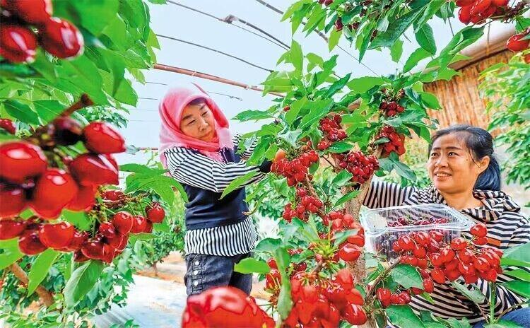 临泽县板桥镇从广西引进种植优质樱桃,吸引众多游客和客商前来采摘、订购。新甘肃·甘肃日报通讯员 王将