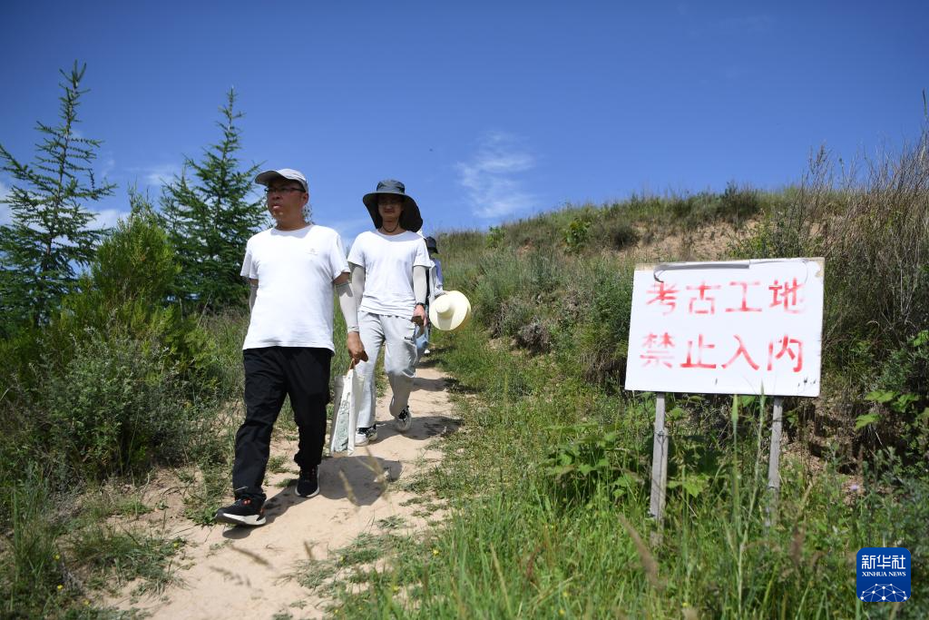 四角坪遗址考古领队、甘肃省文物考古研究所副研究馆员侯红伟(前)带领考古专业研究生在甘肃省陇南市礼县四角坪遗址考古发掘现场工作(2022年6月10日摄)。新华社记者 郎兵兵 摄