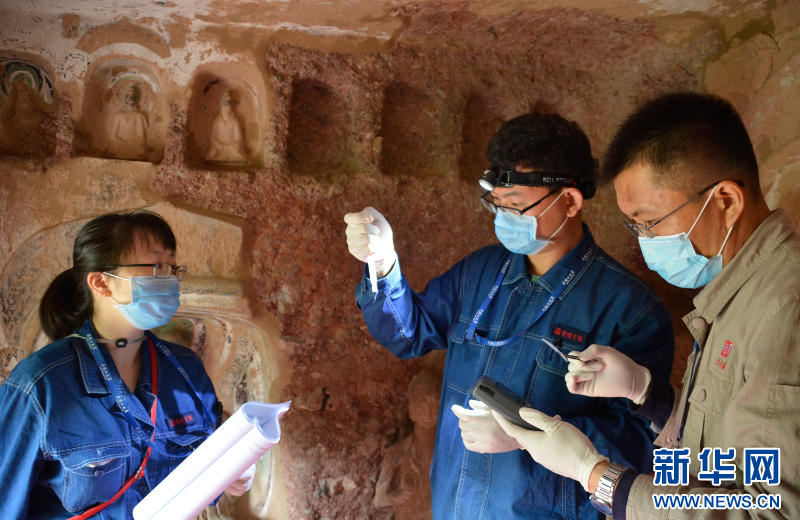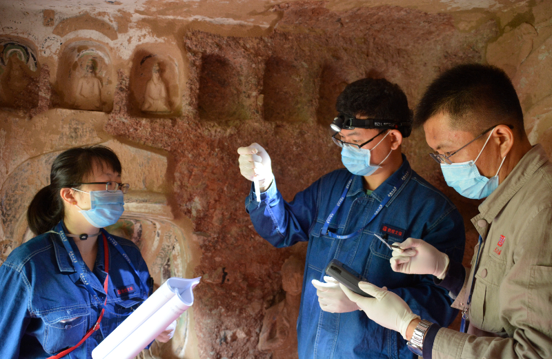 保护工作者在麦积山石窟开展生物病害监测。(受访者供图)