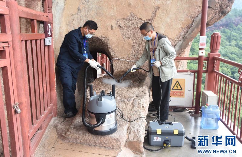 保护工作者在麦积山石窟进行动物排泄物清洗。(受访者供图)