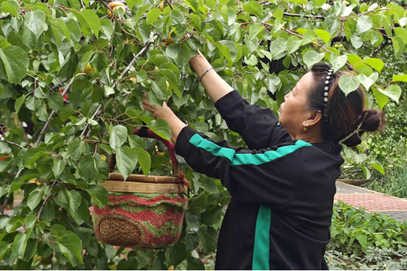 当地村民正在采摘杏子。新华网发(童张伟 摄)