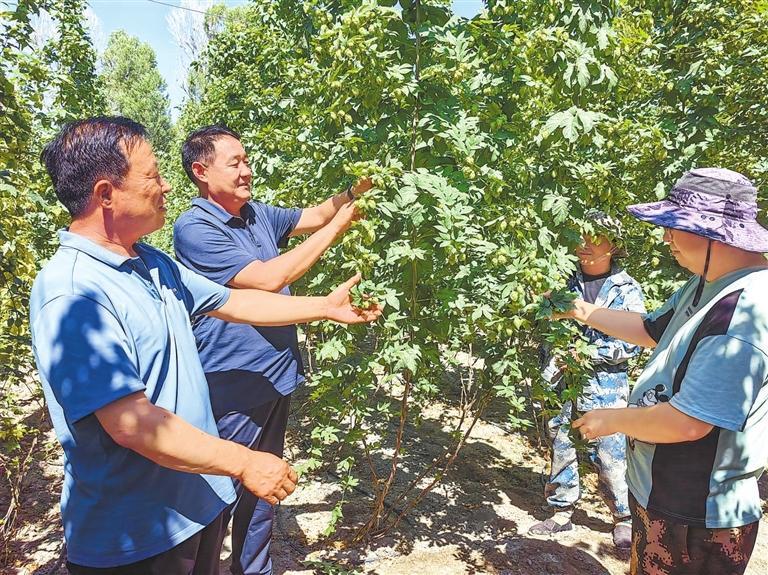 专家查看啤酒花长势。新甘肃·甘肃日报记者 王朝霞