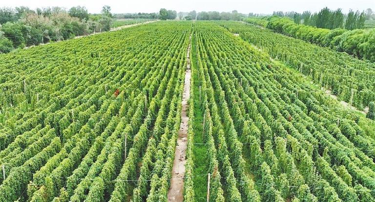 但见一方方啤酒花基地里,一根根松木有序竖立,一根根网线布局整齐,一条条啤酒花藤蔓沿着引线爬升,留出一行行机械通行的空地,田间显得空阔而宽敞。