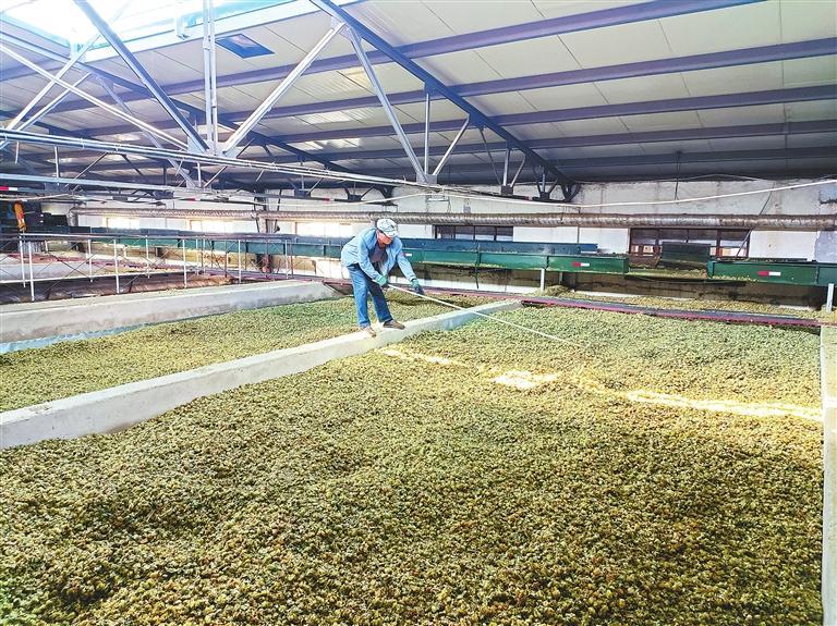 “收获时节,成千上万朵啤酒花绿油油一片,煞是好看!”盛文亮介绍,投资500多万元实施啤酒花顺流烤池项目,改造了传统三层翻板式封闭烤楼,建设敞开式单层铺花卷帘烤池,创新研发自动上花、翻花、下花的啤酒花顺流烤池工艺,能够最大限度实现自动化作业。以加工10万斤鲜花产能计算,烘烤用工从50个降至15个以下,酒花日加工量提升10%,α酸提高0.2%,贮藏指数HSI降低0.03,烘烤质量显著提升。